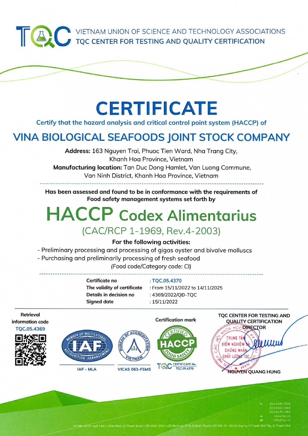 Chứng nhận HACCP Codex Alimentarius cho sản phẩm hàu sữa và các loài nhuyễn thể 2 mảnh.