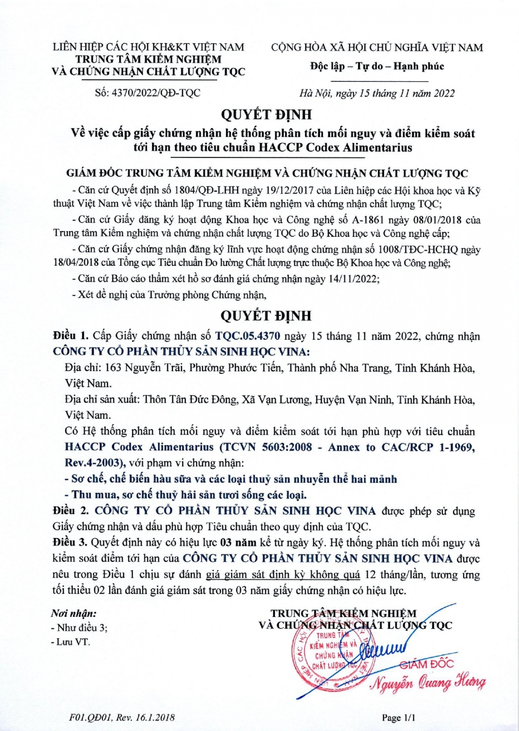 Bên cấp: Trung tâm kiểm nghiệm và chứng nhận chất lượng TQC.