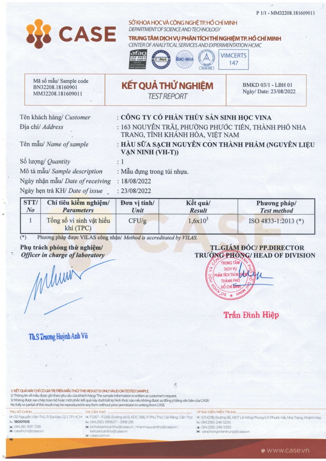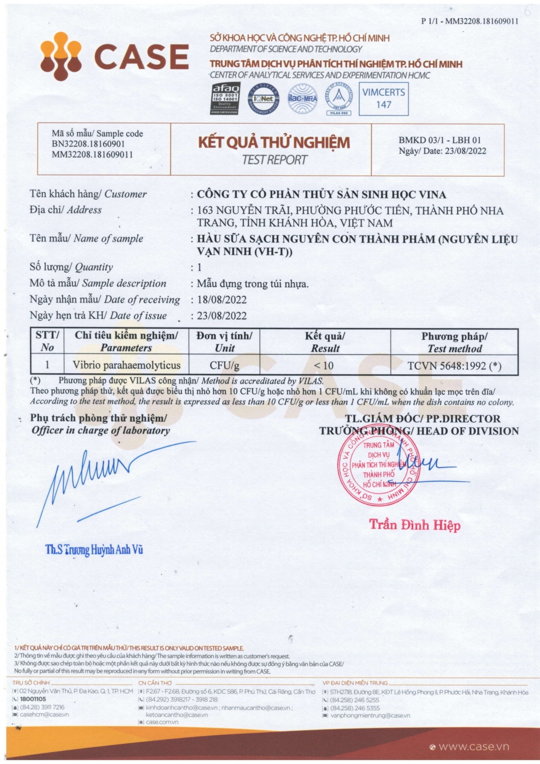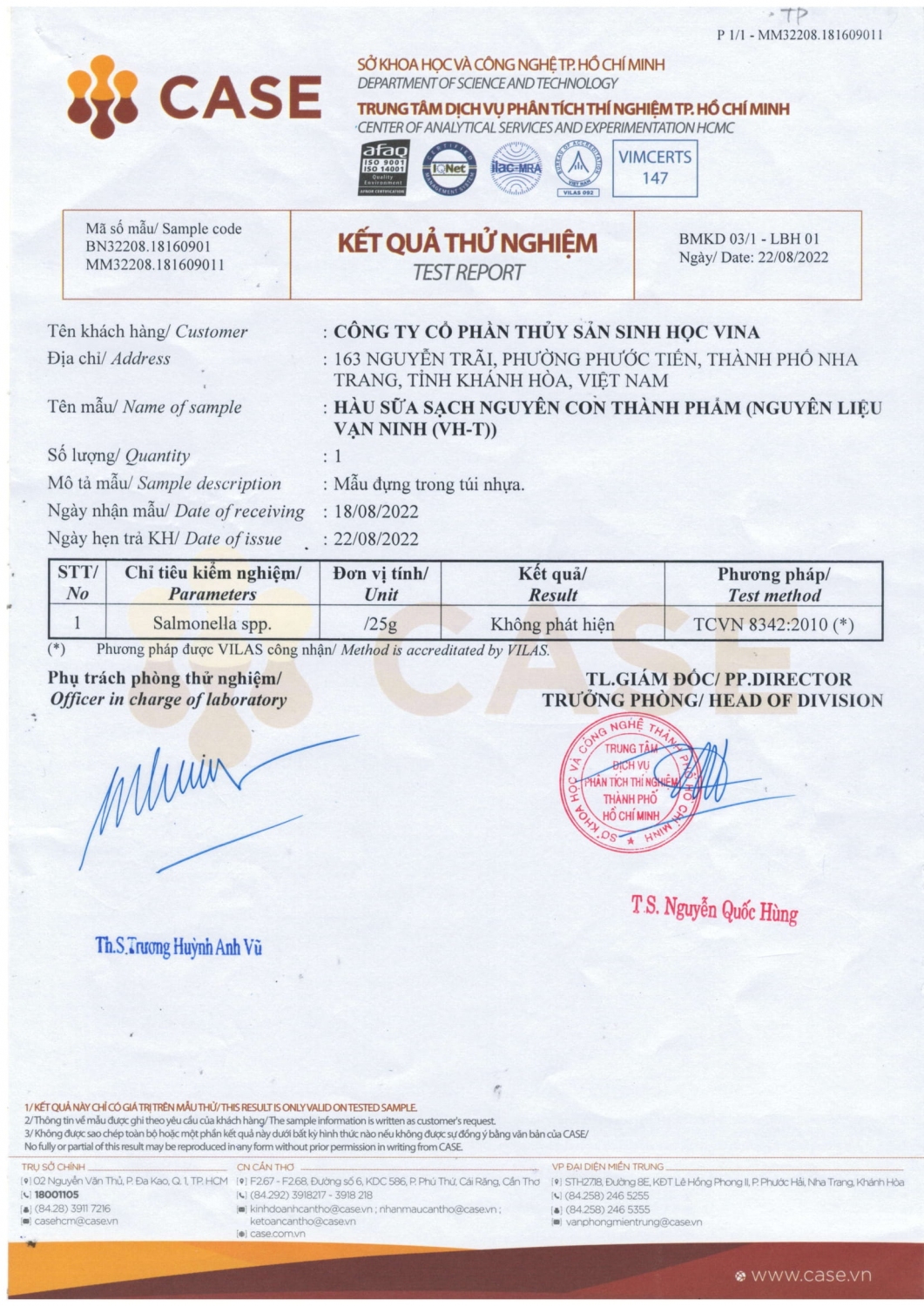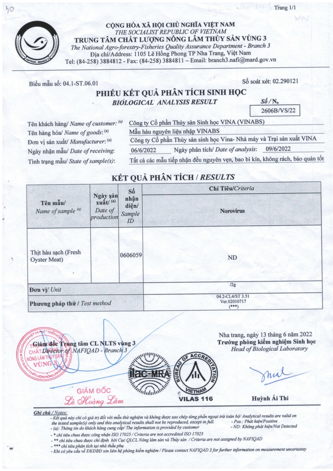 Kết quả kiểm định sinh học của sản phẩm hàu sống của công ty VINABS.