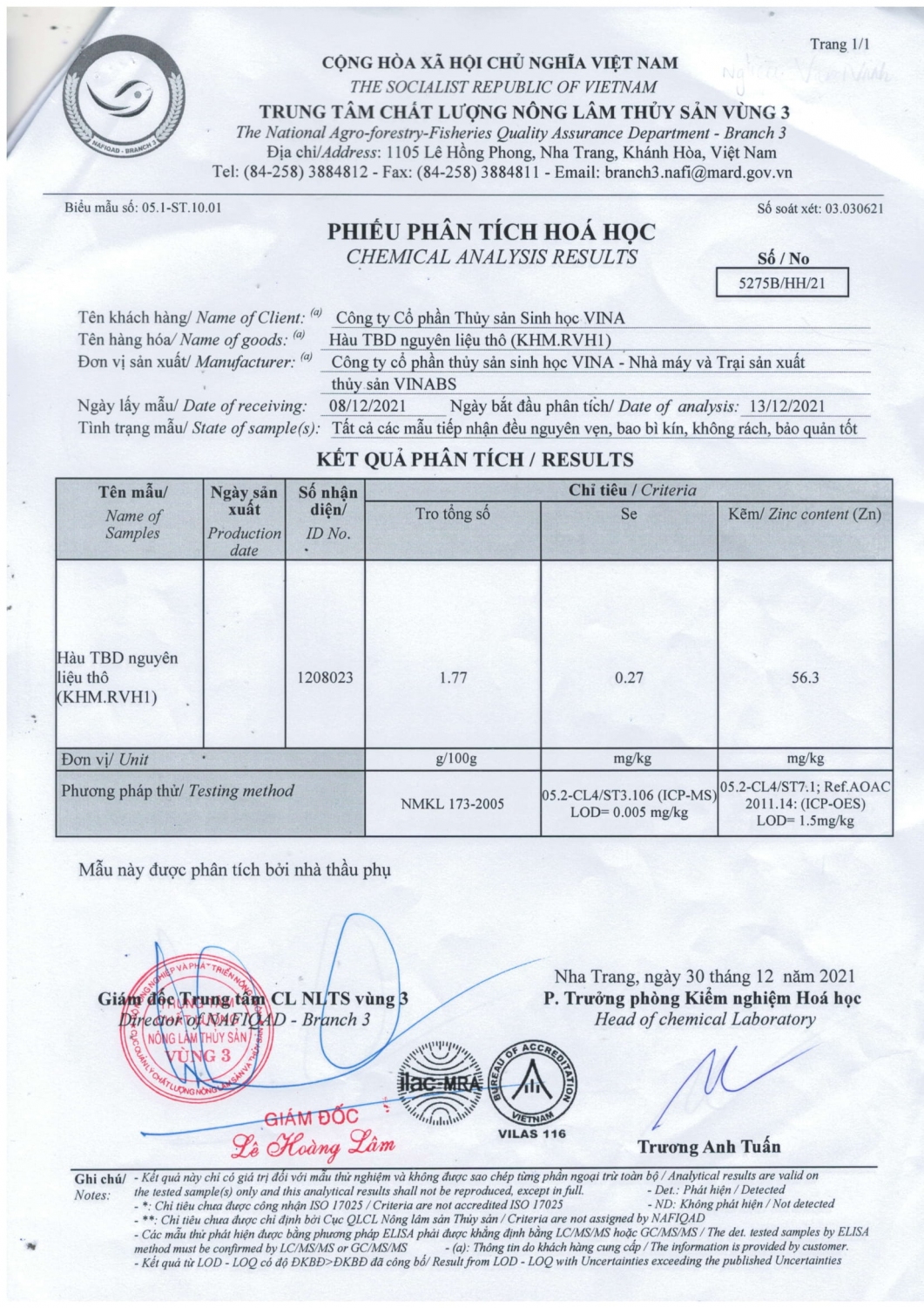 Kết quả phân tích sản phẩm hàu sữa thành phẩm của công ty VINABS.