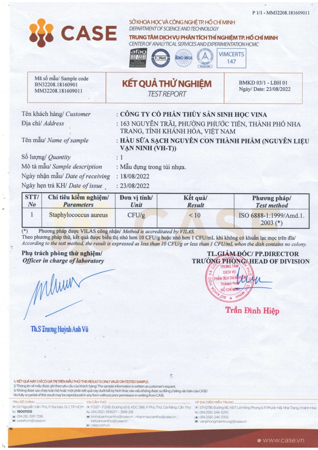 Kết quả phân tích sản phẩm hàu sữa của VINABS.