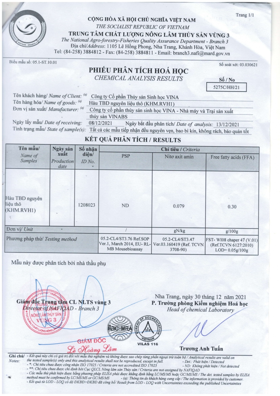 Bên cấp: Trung tâm chất lượng nông lâm thủy sản vùng 3.