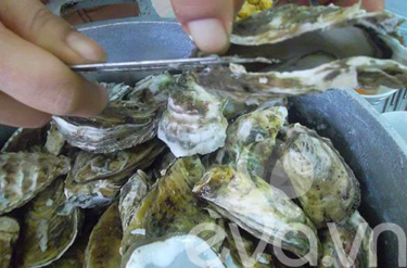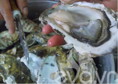 -Sau đó một tay giữ chặt, tay cầm dao ấn mạnh xuống mép hàu.