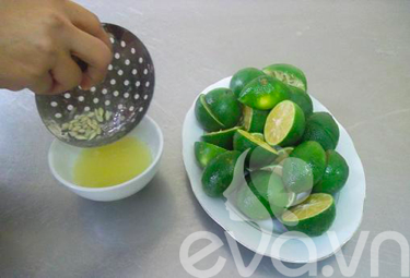 Cắt đôi quả chanh vắt lấy nước cốt chanh bằng một chiếc nuôi thủng. Cho xì dầu và mù tạt ra bát.